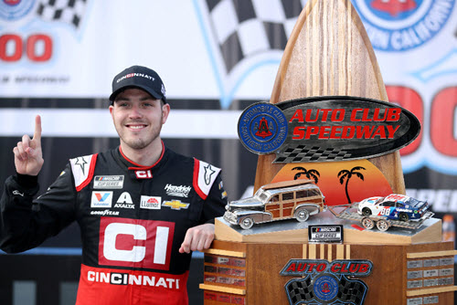 W882023CIALBA. This raced version diecast reflects Alex Bowman's #88 Cincinnati Incorporated paint scheme as it sat in Victory Lane following the Auto Club 400 NASCAR Cup Series race at Auto Club Speedway on Sunday March 1, 2020. Bowman started the race in 3rd position and led a race-high 110 laps, including the final 34 laps of the race to earn the victory for Hendrick Motorsports.