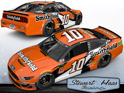 C101922RFAACL. Aric Almirola drove this #10 Smithfield Retro Throwback paint scheme for Stewart Haas Racing in the Bojangles' Southern 500 NASCAR Monster Energy Cup Series race at Darlington Raceway on Sunday September 1, 2019. This paint scheme is inspired by team owner Tony Stewart's 2002 Home Depot paint scheme that he drove to the Winston Cup Championship (beating Mark Martin by 38 points).