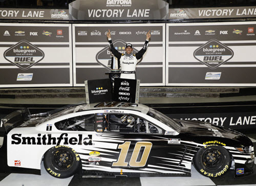 W102122SMTAAABD. This raced version diecast reflects Aric Almirola's #10 Smithfield Mustang as it sat in Victory Lane following the Bluegreen Vacations Duel #1 NASCAR Cup Series qualifying race at Daytona International Speedway on Thursday February 11, 2021. Almirola started the race in 2nd position and led a race-high 52 laps, including the final 24 laps of the race to earn the victory for Stewart Haas Racing.
