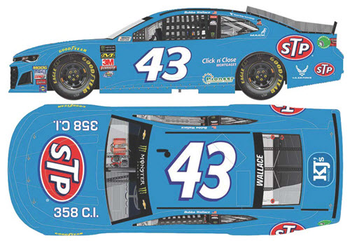 Bubba Wallace drove this #43 STP Darlington Retro Throwback paint scheme for Richard Petty Motorsports in the Bojangles' Southern 500 NASCAR Monster Energy Cup Series race at Darlington Raceway on Sunday September 2, 2018. The paint scheme pays tribute to the Petty-blue car Richard Petty drove in 1972.