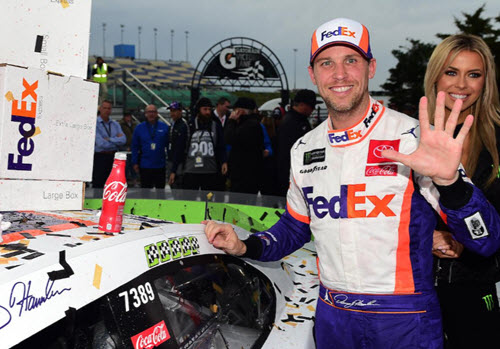 W111923FIDHW. This raced version diecast reflects Denny Hamlin's #11 FedEx Office Camry as it sat in Victory Lane following the Hollywood Casino 400 NASCAR Monster Energy Cup Series race at Kansas Speedway on Sunday October 20, 2019. Hamlin started the race in 23rd position and led a race-high 153 laps, including the final 51 laps of the race to earn the victory for Joe Gibbs Racing.