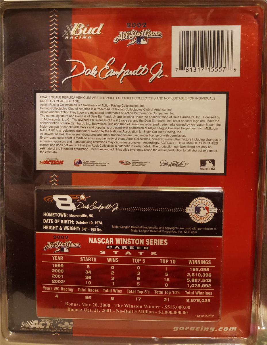 Dale Earnhardt Jr drove this MLB Milwaukee All Star Game paint scheme in the Pepsi 400 at Daytona International Speedway on Saturday July 6, 2002. Jr started the race in 9th position, led one lap, and finished 6th. Michael Waltrip led 99 of the 160 laps, including the final 42 laps, to earn the victory in his NAPA Stars & Stripes Chevrolet for DEI.