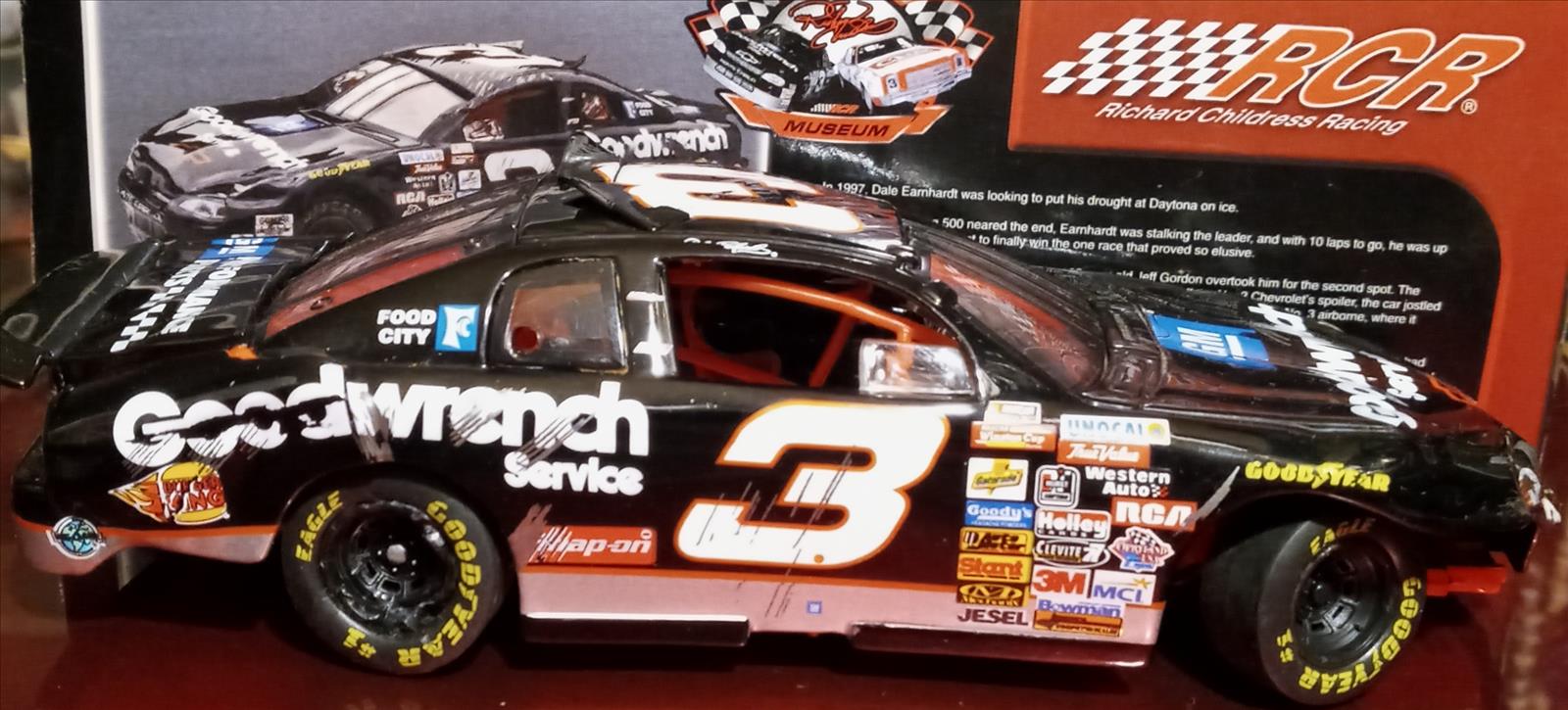 This diecast reflects Dale Earnhardt Sr's GM Goodwrench "crash car" after he was involved in an accident on lap 190 that caused him to flip upside down on the backstretch of the Daytona 500 at Daytona International Speedway on Sunday February 16, 1997. Earnhardt jumped out of the ambulance when he saw that his car was still running and on its wheels, and completed 5 more laps to finish 31st. Jeff Gordon led the final 6 laps of the race to earn the victory in his DuPont Chevrolet for Hendrick Motorsports. A good video of Earnhardt's 1997 Daytona crash can be found at: https://www.youtube.com/watch?v=bWRj6cs8SRg