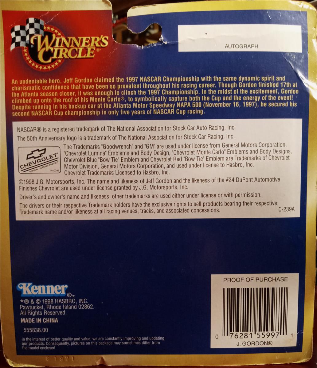 This diecast commemorates Jeff Gordon's 1997 NASCAR Championship and season-ending win in the NAPA 500 on Sunday November 8, 1997 at Atlanta Motor Speedway. Gordon started the race in 21st position, and had the dominant car that day, leading 113 of the 221 laps. Dale Jarrett finished the race in 2nd place (and 3rd in the championship standings), and Mark Martin finished in 3rd place (and 2nd in the championship standings).