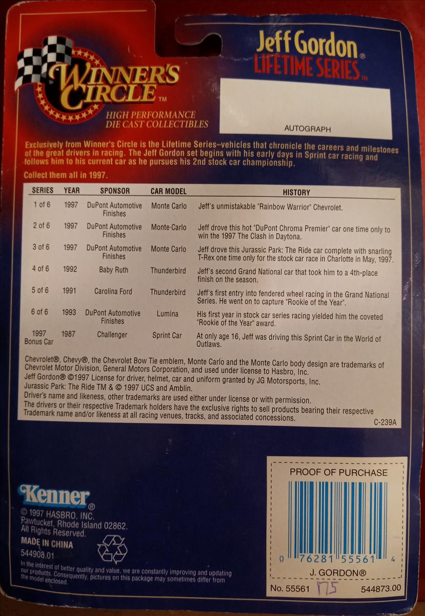 Action Performance records indicate that 44,000 units were produced as Action SKU #H649716077-3 (Hasbro SKU #55561). This diecast reflects the #24 Jurassic Park paint scheme which Jeff Gordon drove in The Winston NASCAR all star race at Chartlotte Motor Speedway on Saturday May 17, 1997. Gordon started the race in 19th position, and took the lead with 9 laps remaining. Gordon led all 9 of those laps to earn the victory and $207,000. Bobby Labonte finished 2nd in his Interstate Batteries Pontiac for Joe Gibbs Racing.