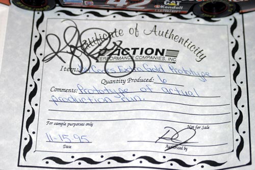Kyle Petty signed the original Action Certificate of Authenticity dated 11/15/95. You will never see another Pumpkin Prototype.