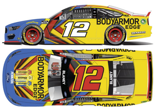 C122122BAERBCL. Ryan Blaney drove this #12 BodyArmor Edge paint scheme for Penske Racing in the Coca-Cola 600 NASCAR Cup Series race at Charlotte Motor Speedway on Sunday May 30, 2021. Blaney started the race in 11th position, led two laps, and finished 13th.