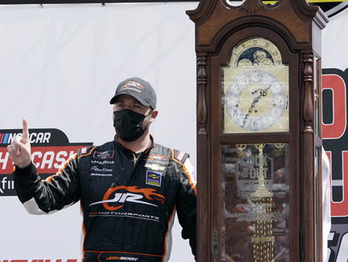WX82165CHEJPF. This raced version diecast reflects Josh Berry's #8 Chevy Accessories Camaro as it sat in Victory Lane following the Cook Out 250 NASCAR Xfinity Series race at Martinsville Speedway on Sunday April 11, 2021. Berry started the race in 29th position and led a race-high 95 laps, including the final 29 laps of the race to earn the victory for JR Motorsports.